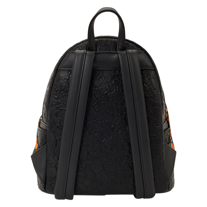 All over, this bag features a debossed pattern of various motifs of the holiday. In the center of the front pocket, you'll find an illustration of a woman and a cat with traditional Día de los Muertos style makeup and art. There's a slot in the front pocket for you to slide in your own picture of your loved ones.