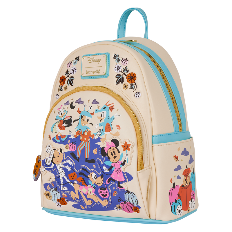 This mini backpack features some of your favorite Disney characters in their Halloween costumes trick-or-treating. Cute autumn motifs like ivy and pumpkins can be found above the front pocket, on the side pockets, and along the straps.